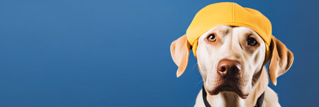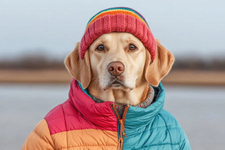 Cute labrador in knitted hat and sweater. Isolated happy dog on light background .Portrait for winter cozy advertisement for knitted pet clothes and other projects