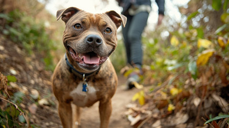Dog with owner on nature trail, capturing the excitement of exploring new places on a pet-friendly vacation