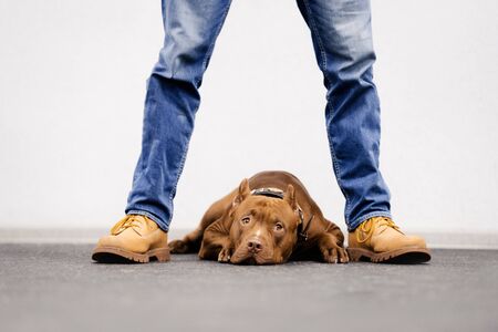 Young, beautiful, american staffordshire terrier with owner spend a day in the park and playing.