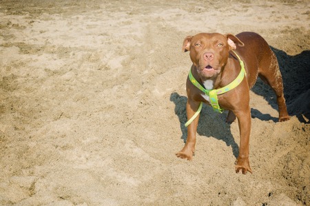Happy smiling dog taking self portrait on the beach. Portrait of a cute staffordshire terrier imitating a selfie shot by the sea in the summer