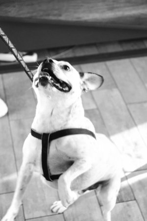Pit Bull Terrier on a walk in the field. Black and white photo.