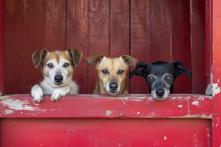 Group of dogs on a wooden fence. Selective focus. Animals.