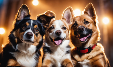 Three friendly dogs are facing the camera, displaying their unique fur and bright expressions in a lively venue.
