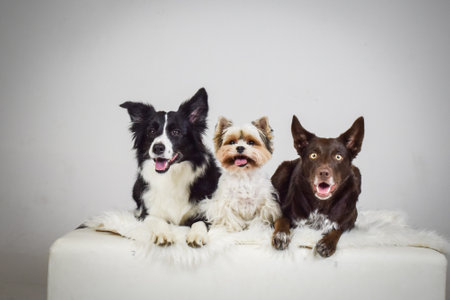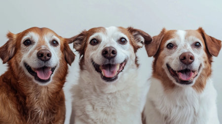 Three cheerful dogs stand side by side in a studio, showing their diverse fur coats and vibrant smiles. Each dog exudes a playful and friendly vibe.