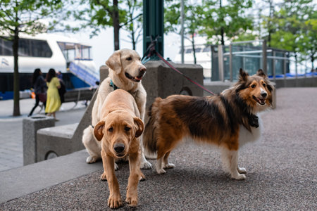owners walking with their cute pets, joy of dog walking and urban pet care.
