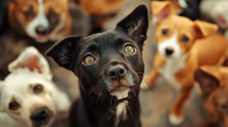 A mix of dog breeds and sizes sit together, showing their unique features and friendly faces with room for text.