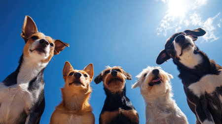 A cheerful group of five dogs stands together, looking up against a vivid blue sky adorned with clouds. Their expressions convey joy and friendship, capturing the essence of playful camaraderie in a sunny outdoor environment.