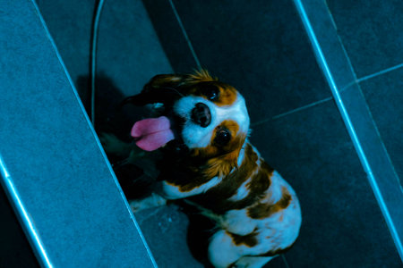 Dog looks up at camera in home setting with wooden floor and soft lighting