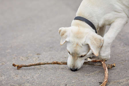 Cutie dog playing with wooden stick on the natural background. Pet concept.