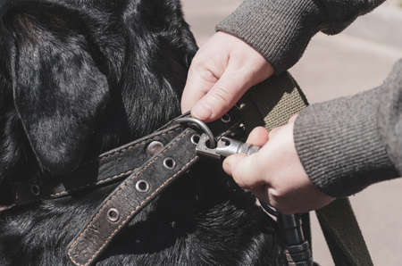 Close-up of a woman's hands fastening an unbreakable carabiner to her dog's collar. The owner fastens the leash to the collar of the female Rottweiler. Daytime. Selective Focus.