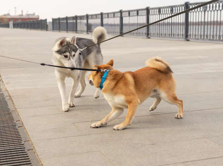 meeting of two dogs while walking