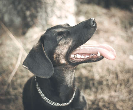 Happy stray dog. A dog with a protruding tongue is resting