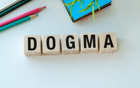 DOGMA text on the wooden block with notebooks keyboard with chart