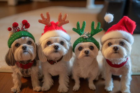 Four adorable dogs wearing festive christmas hats and antlers