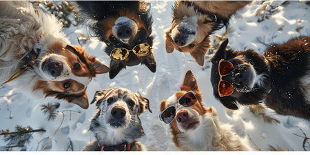 Playful dogs capture snowy selfies with sunglasses enjoying winter woods Christmas vibes. Concept Dogs in Snow, Selfies with Sunglasses, Winter Woods, Christmas Vibes, Playful Pets