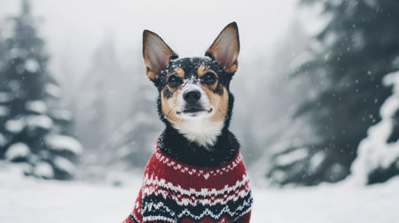 Adorable dog wearing a cozy winter sweater sits in a snowy setting, surrounded by trees and falling snowflakes, offering blank space for text.