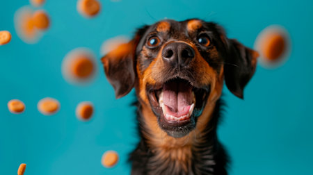 This energetic dog shows pure joy with its mouth open wide and eyes sparkling, eagerly catching treats that are falling around it in a vibrant blue environment.