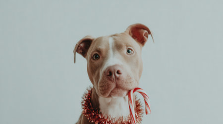 A close-up studio portrait of a light-colored Pitbull dog adorned with a festive garland, looking directly at the camera.