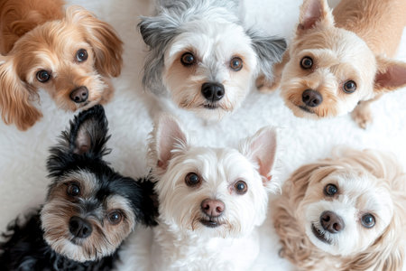 Top view photography of multiple dogs on a clean white background for a playful atmosphere