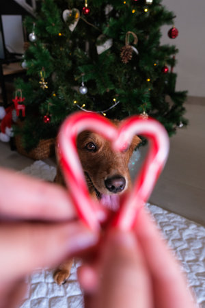 Female hands made a heart from two candy canes, a backdrop golden retriever dog
