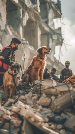 Focused rescue dog amidst earthquake rubble, showcasing the importance of canine units in disaster recovery.