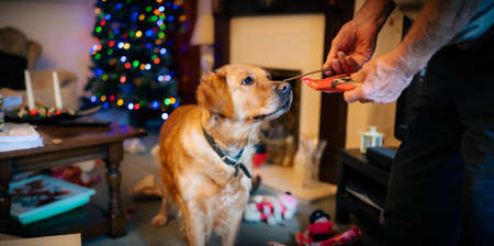 happy golden retriever dog on christmas day in a home setting receiving a chewy dog treat snack with fire place and christmas tree blurred in background