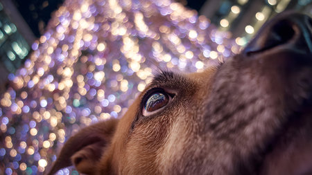A dog looks at a Christmas tree in the city. Close-up.
