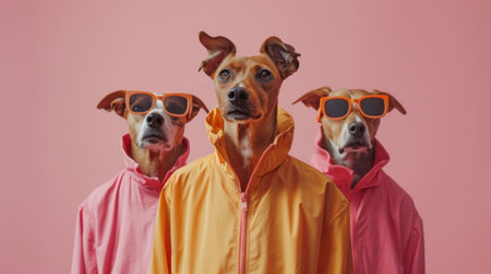 Three stylish dogs in colorful jackets and sunglasses posing on a vibrant pink background with playful expressions