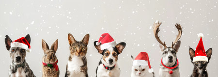 Group of dogs, cats, and rabbits with festive hats and reindeer antlers against a snowy background. Concept of Christmas pets, holiday celebration, winter festive animals. Copy space.