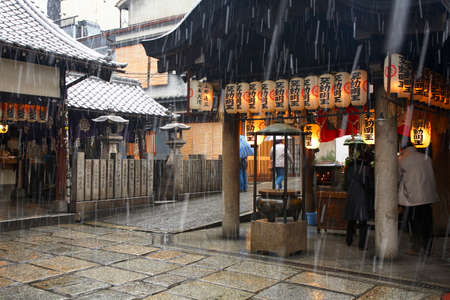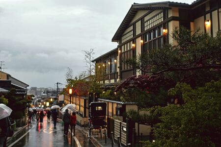 Street view of Kyoto Prefecture during Spring rain storm in Kyoto, Japan