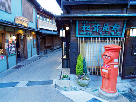 Nagano, Japan - April 20, 2019 : View of shop in Narai Post town (Narai-Juku) Japan Old wooden house and narrow street in Kiso Valley of Nagano Japan.