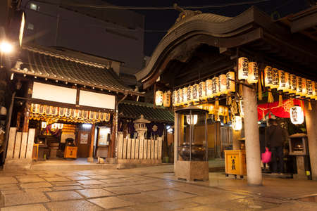 KYOTO, JAPAN - APRIL 19 Famous Nishiki Tenmangu Shrine with people and illuminated paper lanterns hanging above the entrance in Kyoto, Japan on 19th April 2014 The shrine is located in the heart of Nishiki food market street