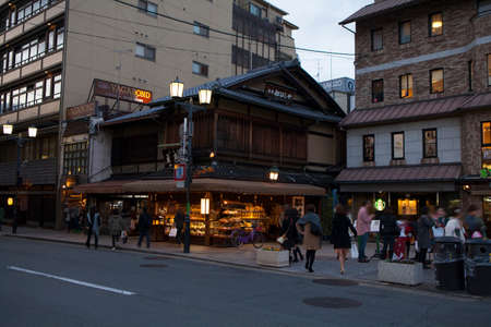 KYOTO, JAPAN - NOVEMBER 7, 2017: View of shops on the city street. Copy space for text