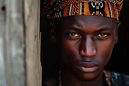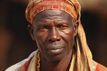 Close-up portrait of a man wearing sunglasses and colorful traditional African attire, exuding confidence and cultural pride.