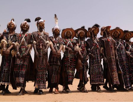 Men dancing Yaake dance and sing at Guerewol festival - 23 september 2017 InGall village, Agadez, Niger