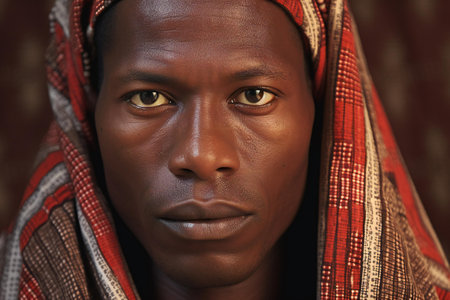 Tuareg man looking directly at viewer, wearing a traditional teal turban