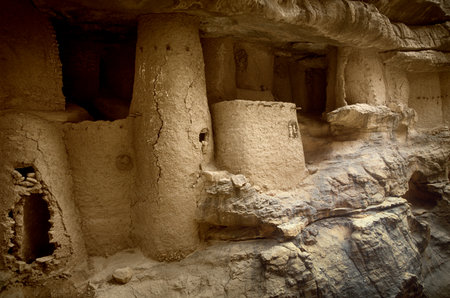 Gommo, Mali, Africa - January 26, 1992: Dogon village, typical mud buildings with animist temple and barns for cereals, climb with ropes up to the tombs of ancestors telem with skulls