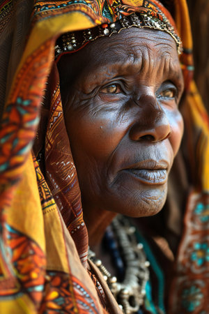 Close up portrait of a black African woman wearing a black hat and a black scarf