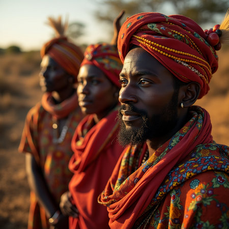 A close-up portrait of three african individuals dressed in vibrant ethnic clothing.
