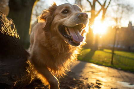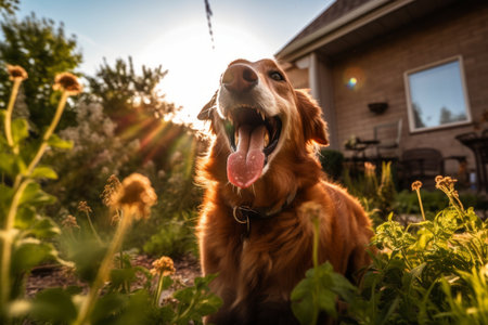Happy Retriever dog in the garden at sunset. Selective focus.