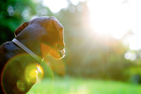 Beagle dog on field in the morning looking into sun rays in forest.