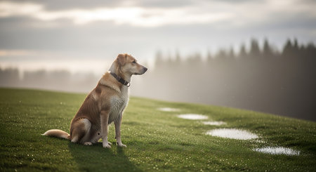 Red dog sitting on a green meadow in the morning fog.
