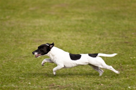 Blurred little white dog Jack Russell runs across a clearing of green grass. Running away from the frame into the distance. Panorama view. Texture. Copyspace