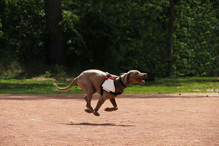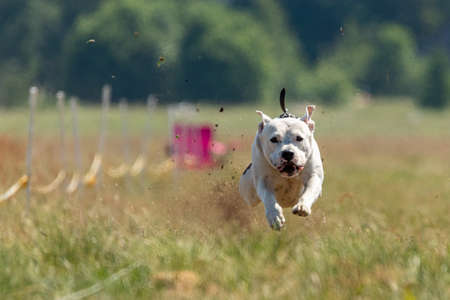 Sportive dog performing during the lure coursing in competition. Pet sport, motion, action, showing, performance concept. Pets love. Young animal training before performing. Looks strong, purposeful.
