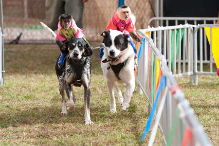 Hampton, GA, USA - September 27, 2014: Costumed monkeys ride dogs in a race at the Georgia State Fair in Hampton.