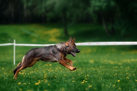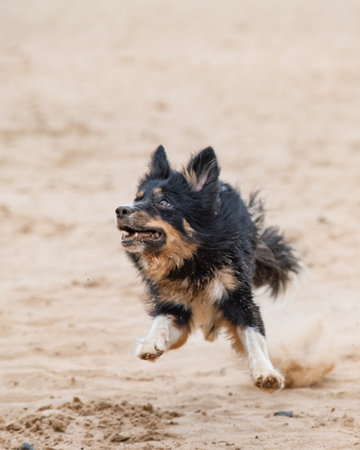 The cheerful dog runs along a path through sand and grass isolated with a blurred background in the countryside in Poland