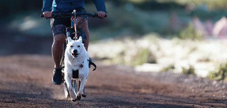 Bikejoring dog mushing race. Dog pulling bike with bicyclist, competition in forest, sled dog racing. Spring outdoor sport activity