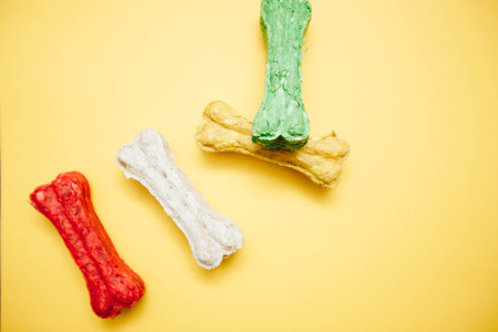Yellow one-color background with colored dog bone snacks in a row, close up, top view. Pet care and veterinary concept. Spase for your text or image.