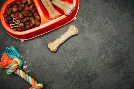 Dry pet food in bowl and chewing bones on dark stone background top view copyspace