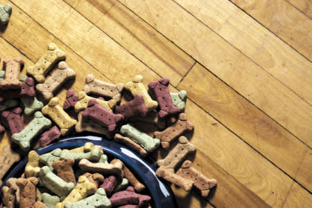 Dog tasty colored biscuits on wooden background, snacks for dogs. Healthy dry pet food concept